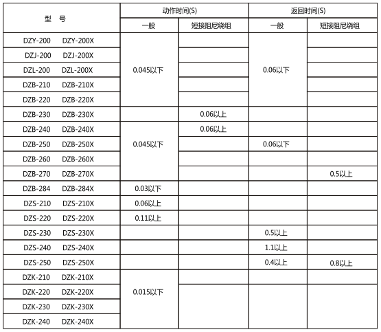 2.1動作電壓與保持電壓不大于70%額定電壓, DZY(J)-210動作電壓不大于80%額定電壓;動作電壓不小于30%額定電壓, DZK-200及DZB 243不小于50%額定電壓。
