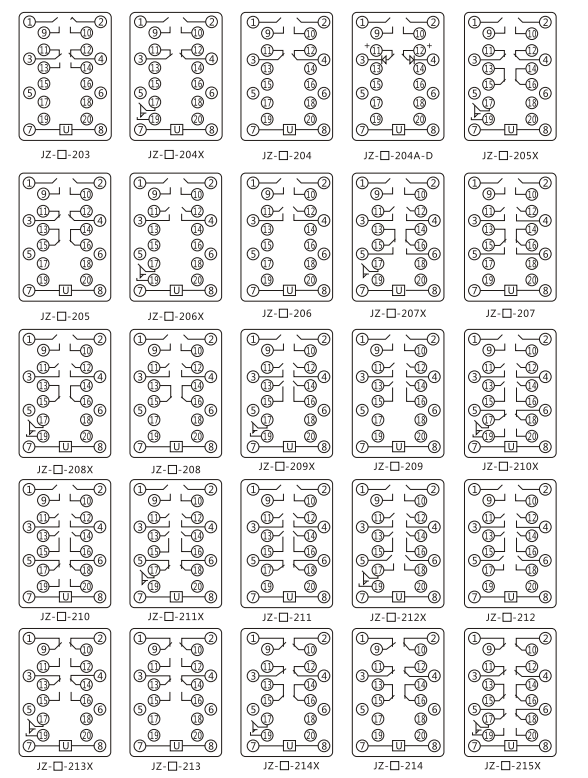 JZ-□-2□□系列內(nèi)部接線圖及外引接線圖(正視圖)